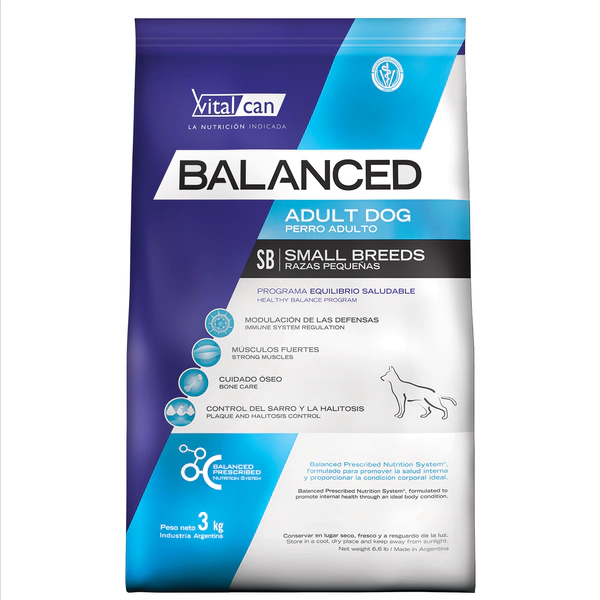 Vitalcan Balanced Perro Adulto Raza Pequeña ofrece una nutrición específica para las necesidades de tu perro adulto de raza pequeña. Está formulada para lograr un óptimo equilibrio orgánico y estructural en la adultez. Dado el metabolismo acelerado propio de las razas pequeñas, la formulación brinda niveles elevados de nutrientes, en croquetas específicas para su tipo de mordida. Una solución nutricional a medida, formulada para promover la salud interna, proporcionando una condición corporal ideal para todas las etapas de la vida del animal. Modulación de las defensas Formulado con vitamina C y nucleótidos de levadura que actúan como moduladores de las defensas ayudando a conferir una óptima respuesta inmunológica. Vitalcan Balanced Perro Adulto Raza Pequeña refuerza los músculos Contiene proteínas de alta calidad que favorecen el mantenimiento de una excelente masa muscular fuerte y magra. Control del sarro y la halitosis La inclusión de hexametafosfato de sodio ayuda a prevenir la formación de sarro dental y su influencia sobre la halitosis. Cuidado óseo Aporta cantidades equilibradas de calcio y fósforo que contribuyen a mantener huesos sanos y fuertes. Balanced® Fitting Program Se trata de un programa desarrollado especialmente por Vitalcan que adapta la dieta con las cantidades de energía y proteínas necesarias para cada etapa de vida y tamaño del animal. Ver otros productos de Vitalcan Balanced para perros. Ver consejos para el cuidado de tu mascota